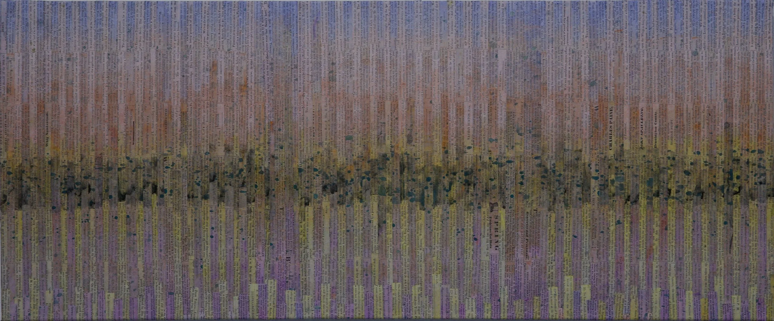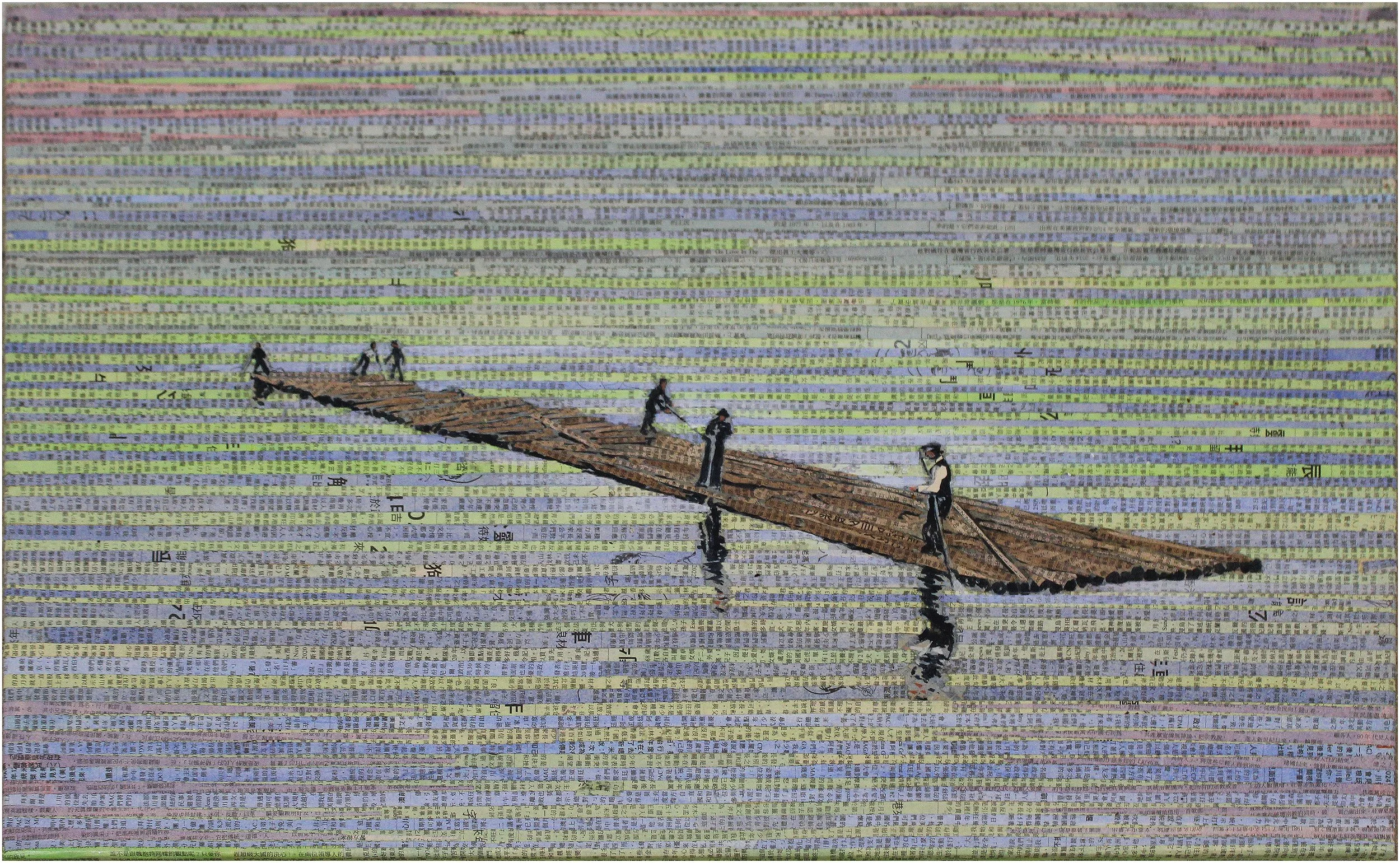 I began this work in 1998, at which time I loosely placed large pieces of news print on a canvas, then painted the logs and loggers on top of that collage. But recently i decided to redo the background and created and more detailed shimmering effect, bringing life to the water surrounding the logs.